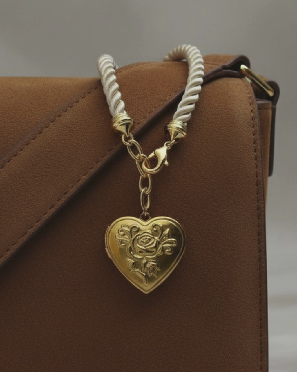 Gold heart-shaped locket bag charm with engraved floral detail, suspended from a cream twisted cord and brass ring